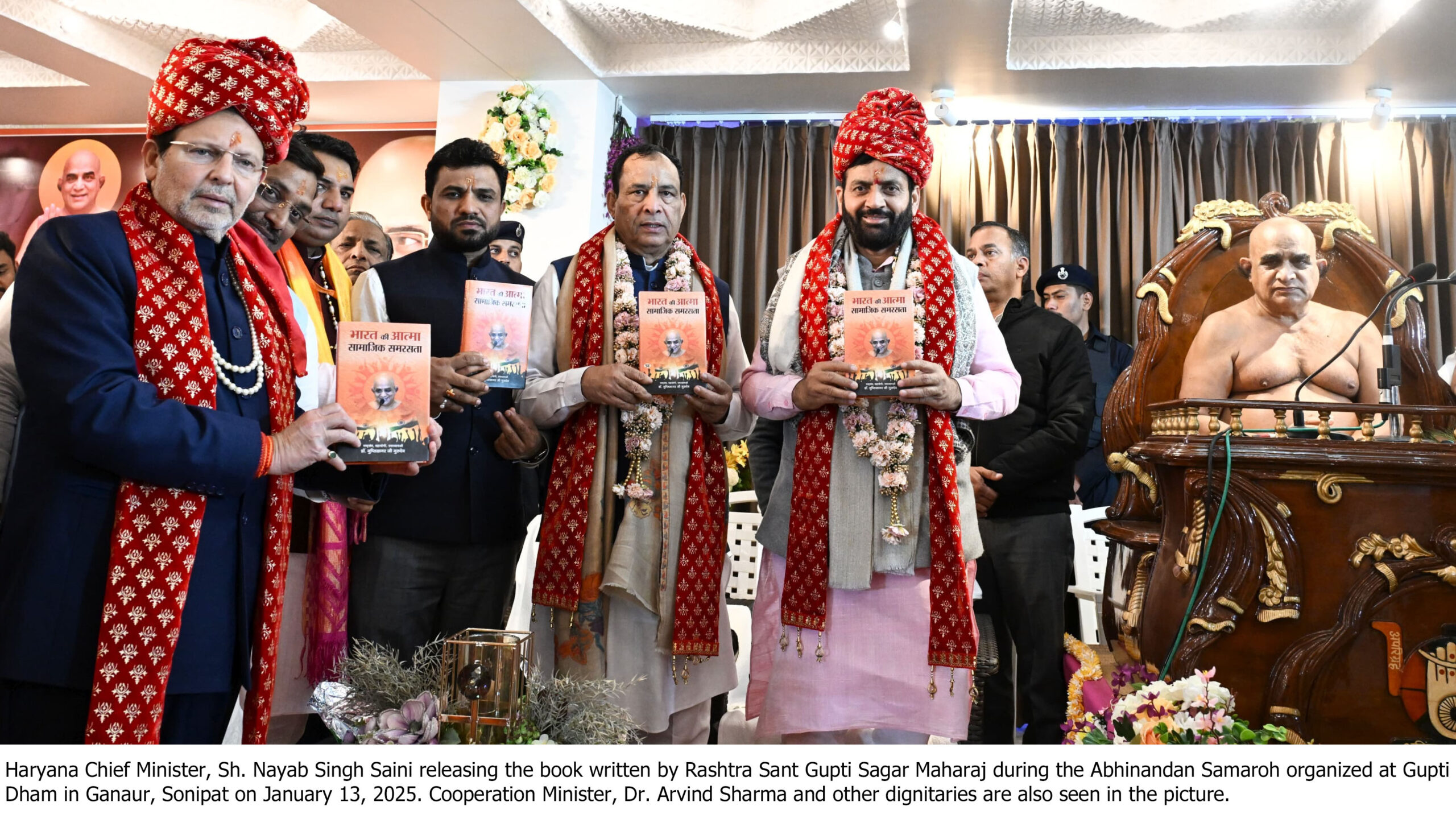 Haryana Chief Minister, Nayab Singh Saini releasing the book written by Rashtra Sant Gupti Sagar Maharaj during the Abhinandan Samaroh organized at Gupti Dham in Ganaur, Sonipat on January 13, 2025. Cooperation Minister, Dr. Arvind Sharma and other dignitaries are also seen in the picture.