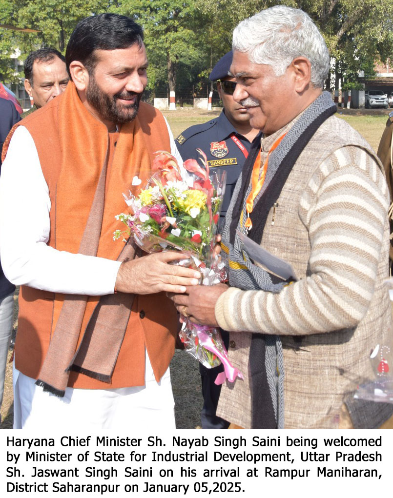 Chandigarh, January 5 : Saini Shiksha Prasar Samiti, Saharanpur, Uttar Pradesh, organized a felicitation function today in honor of Haryana Chief Minister, Sh. Nayab Singh Saini, at Mandapam Palace in Islamnagar, Rampur Maniharan. Upon his arrival, the Chief Minister was given a warm and enthusiastic welcome by the people.