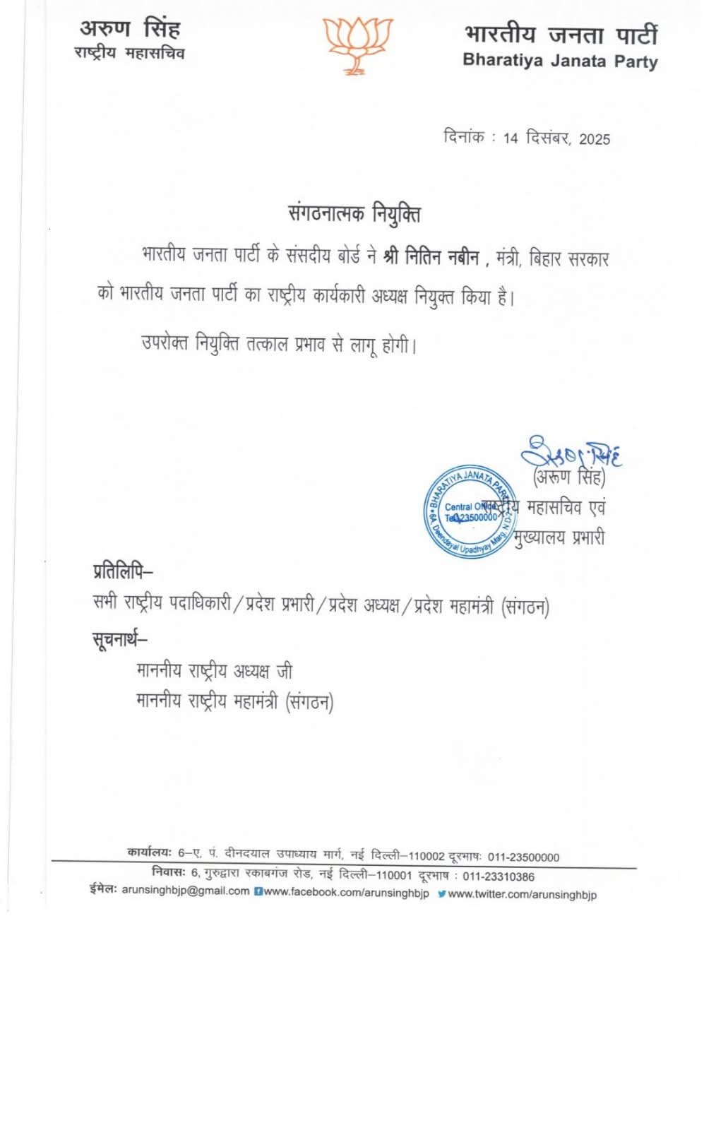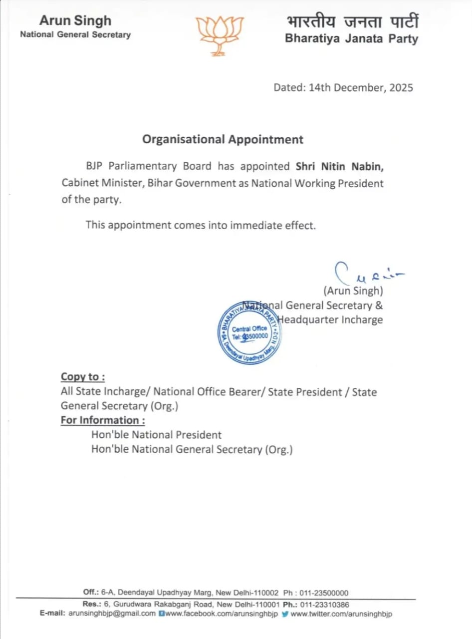 National बीजेपी के राष्ट्रीय कार्यकारी अध्यक्ष बने नितिन नबीन, बिहार सरकार में हैं मंत्री admin December 14, 2025 भारतीय जनता पार्टी ने संगठनात्मक स्तर पर बड़ा फैसला लेते हुए बिहार सरकार में मंत्री नितिन नबीन (45) को पार्टी का राष्ट्रीय कार्यकारी अध्यक्ष नियुक्त किया है. इस नियुक्ति को बिहार के साथ-साथ राष्ट्रीय राजनीति में बीजेपी की रणनीतिक मजबूती के तौर पर देखा जा रहा है. पार्टी नेतृत्व ने उनके संगठनात्मक अनुभव, जमीनी पकड़ और प्रशासनिक क्षमता को देखते हुए यह अहम जिम्मेदारी सौंपी है. नितिन नबीन बीजेपी के सबसे कम उम्र के अध्यक्ष बने हैं. Continue Reading Previous: ਪੰਜਾਬ ਵਿੱਚ ਖੇਡਾਂ ਦਾ ਸੁਨਹਿਰੀ ਯੁੱਗ,ਮਾਨ ਸਰਕਾਰ ਦਾ ਪ੍ਰਭਾਵ, 1,000 ਕਰੋੜ ਅਲਾਟNext: State Election Commission orders to conduct re-poll at some places, to be held on 16.12.2025 Related Stories National CCPA imposed 1.09 Crore Penalty on 28 Coaching Institutes admin December 25, 2025 National चंडीगढ़ के लिए कानून बनाने पर केंद्र का स्पष्टीकरण, कोई फैसला नहीं admin November 23, 2025 National Centre Clarifies: No Change Proposed in Chandigarh’s Governance admin November 23, 2025