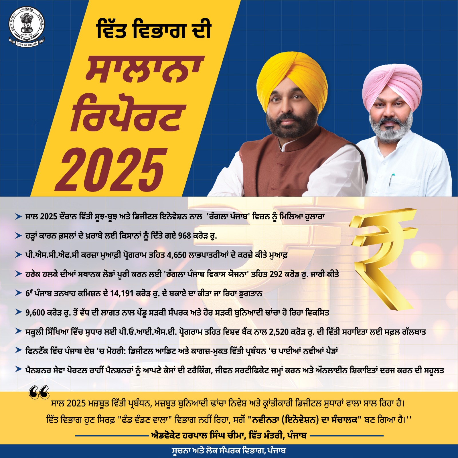 ਵਿੱਤ ਵਿਭਾਗ ਦੀ ਸਲਾਨਾ ਰਿਪੋਰਟ ਦਾ ਸਿੱਟਾ ਕੱਢਦਿਆਂ ਵਿੱਤ ਮੰਤਰੀ ਐਡਵੋਕੇਟ ਹਰਪਾਲ ਸਿੰਘ ਚੀਮਾ ਨੇ ਕਿਹਾ ਕਿ ਮੁੱਖ ਮੰਤਰੀ ਭਗਵੰਤ ਸਿੰਘ ਮਾਨ ਦੀ ਅਗਵਾਈ ਹੇਠ ਸੂਬੇ ਨੇ ਅਤਿ-ਆਧੁਨਿਕ ਵਿੱਤੀ ਤਕਨਾਲੋਜੀ ਨੂੰ ਅਪਣਾਉਂਦਿਆਂ ਜ਼ਮੀਨੀ ਪੱਧਰ ਦੇ ਵਿਕਾਸ ਨੂੰ ਸਫਲਤਾਪੂਰਵਕ ਸੰਤੁਲਿਤ ਕੀਤਾ ਹੈ। ਵਿੱਤ ਮੰਤਰੀ ਨੇ ਅੱਗੇ ਕਿਹਾ, “ਜੰਗਲਾਤ ਅਤੇ ਕਾਰਜ ਵਿਭਾਗਾਂ ਵਿੱਚ ਜਮ੍ਹਾਂ ਕੰਮਾਂ ਦੇ ਸਵੈਚਾਲਨ ਅਤੇ ਇੱਕ ਗੈਰ-ਖਜ਼ਾਨਾ ਲੇਖਾ ਪ੍ਰਣਾਲੀ ਦੀ ਸ਼ੁਰੂਆਤ ਰਾਹੀਂ, ਅਸੀਂ ਲੀਕੇਜ ਨੂੰ ਰੋਕਿਆ ਹੈ ਅਤੇ ਇਹ ਯਕੀਨੀ ਬਣਾਇਆ ਹੈ ਕਿ ਇੱਕ-ਇੱਕ ਰੁਪਏ ਦਾ ਲੇਖਾ-ਜੋਖਾ ਹੋਵੇ। ਅਸੀਂ 2026 ਵਿੱਚ ਇੱਕ ਮਜ਼ਬੂਤ ਬੈਲੇਂਸ ਸ਼ੀਟ ਅਤੇ ਇੱਕ ਖੁਸ਼ਹਾਲ ਪੰਜਾਬ ਲਈ ਇੱਕ ਸਪਸ਼ਟ ਦ੍ਰਿਸ਼ਟੀਕੋਣ ਨਾਲ ਪ੍ਰਵੇਸ਼ ਕਰਾਂਗੇ।”